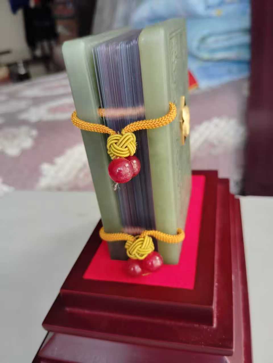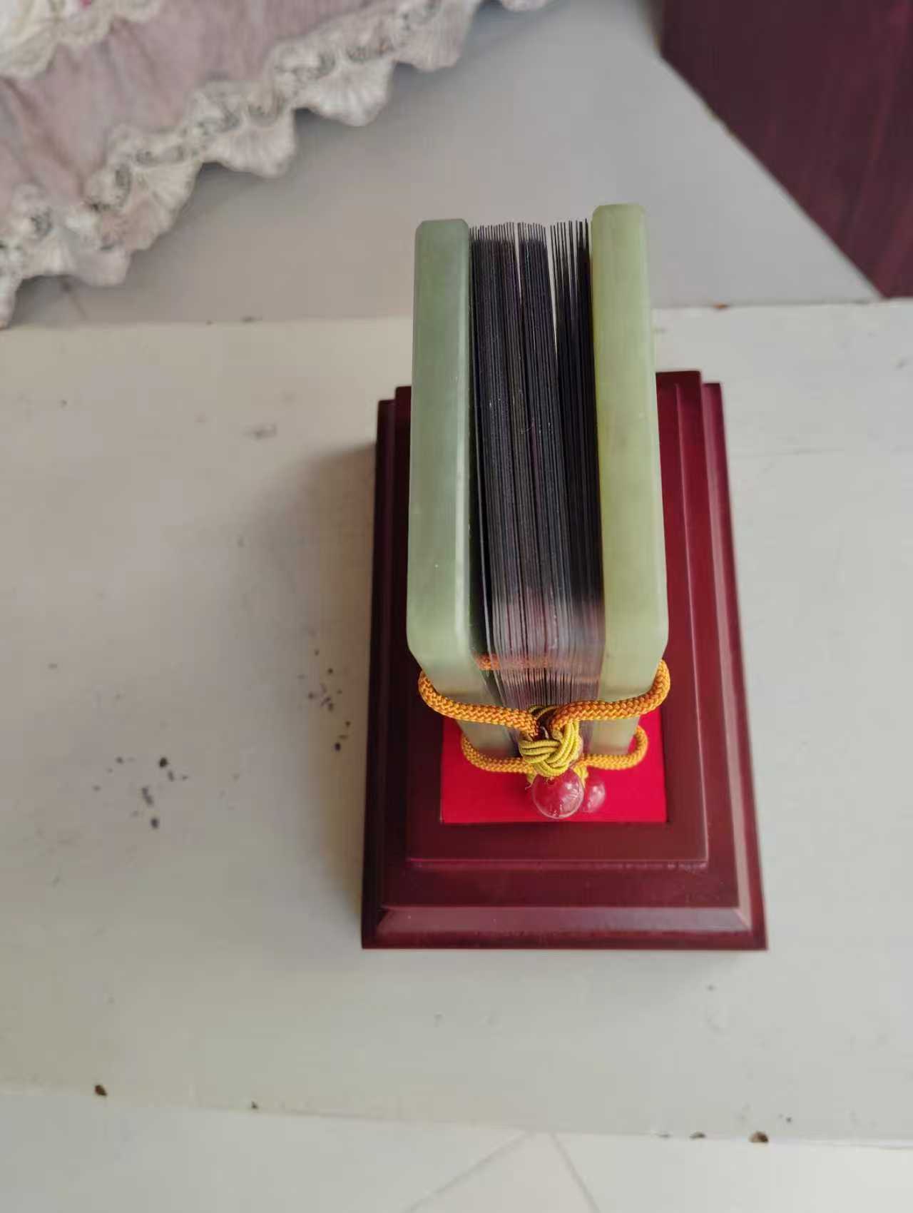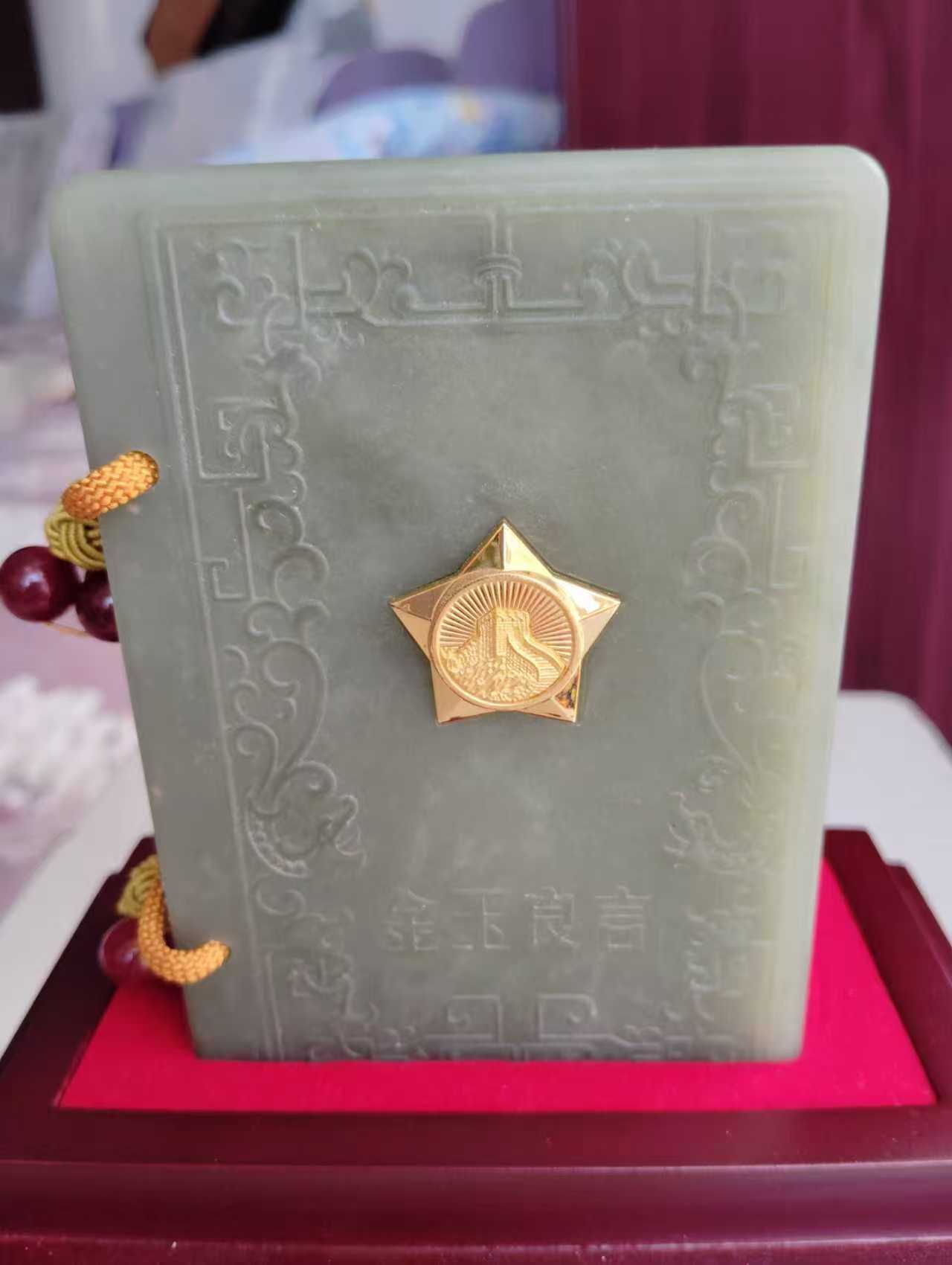 主体:以和田玉(图中为青白玉 / 青玉材质) 打造 “玉书” 造型,封面雕刻传统纹样,还嵌有金色五角星徽章。书页部分用70 克千足银制作,封面有 “金玉良言” 字样,搭配红绳 + 玛瑙珠装饰,整体置于木质底座 / 礼盒中。