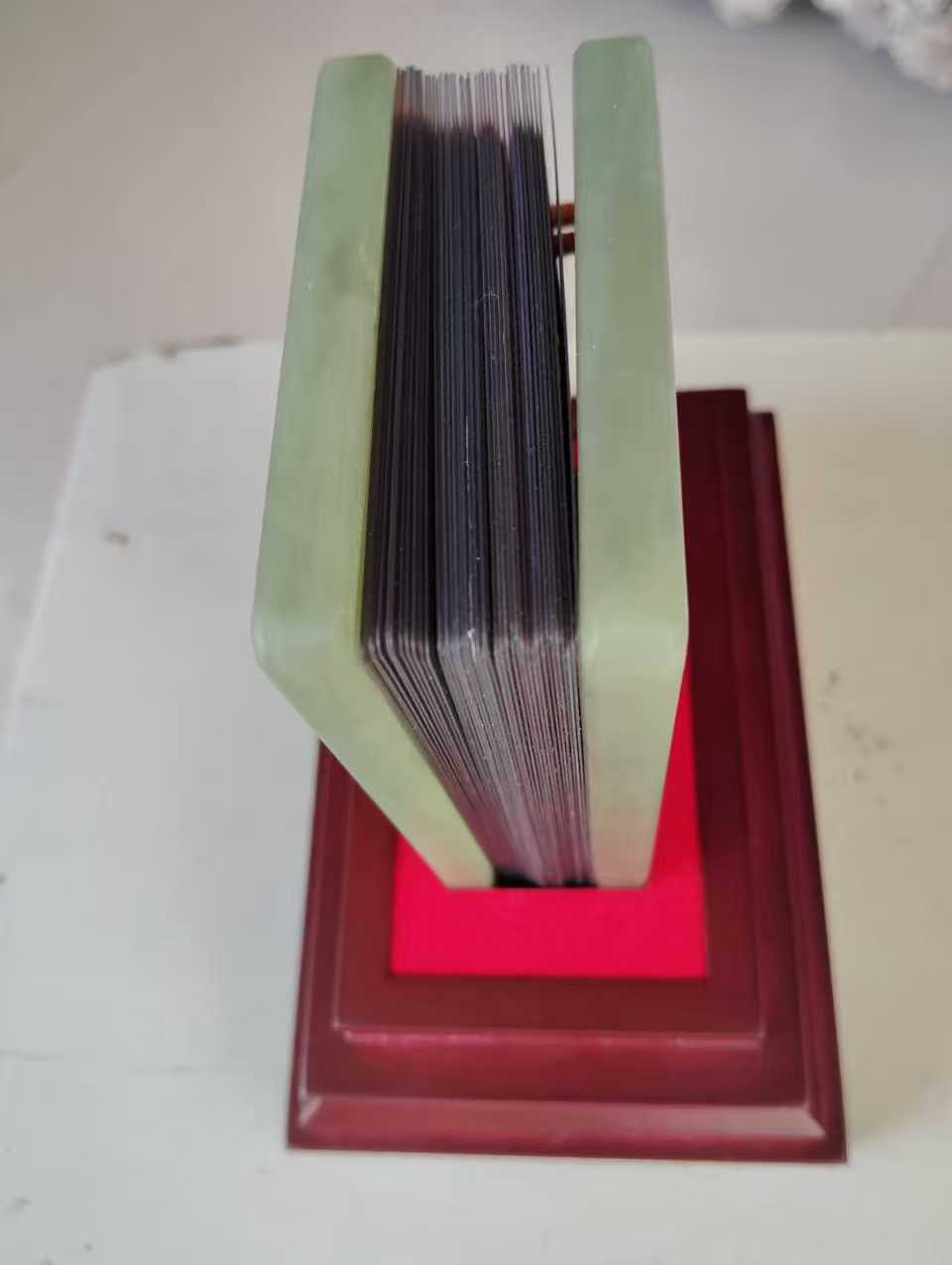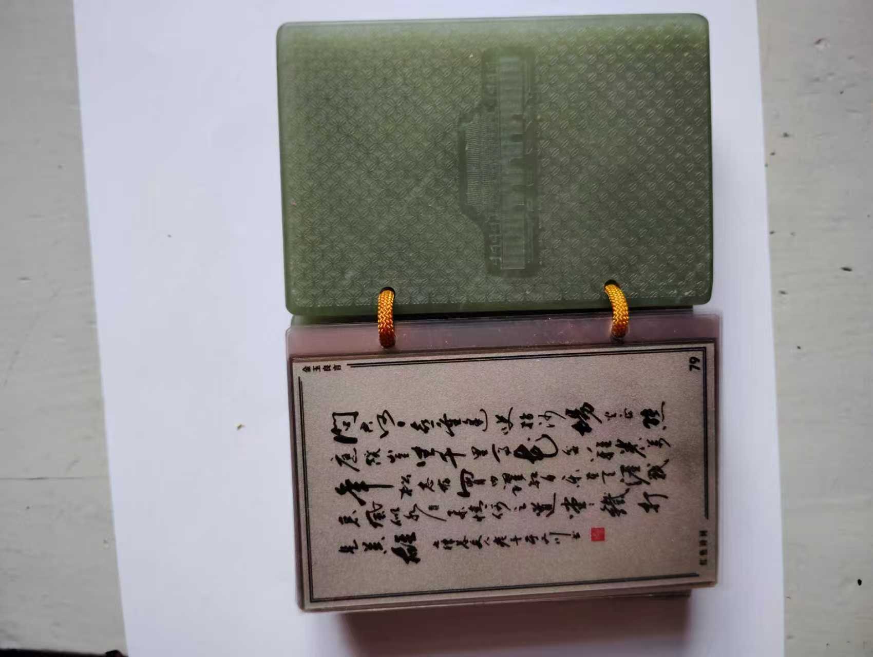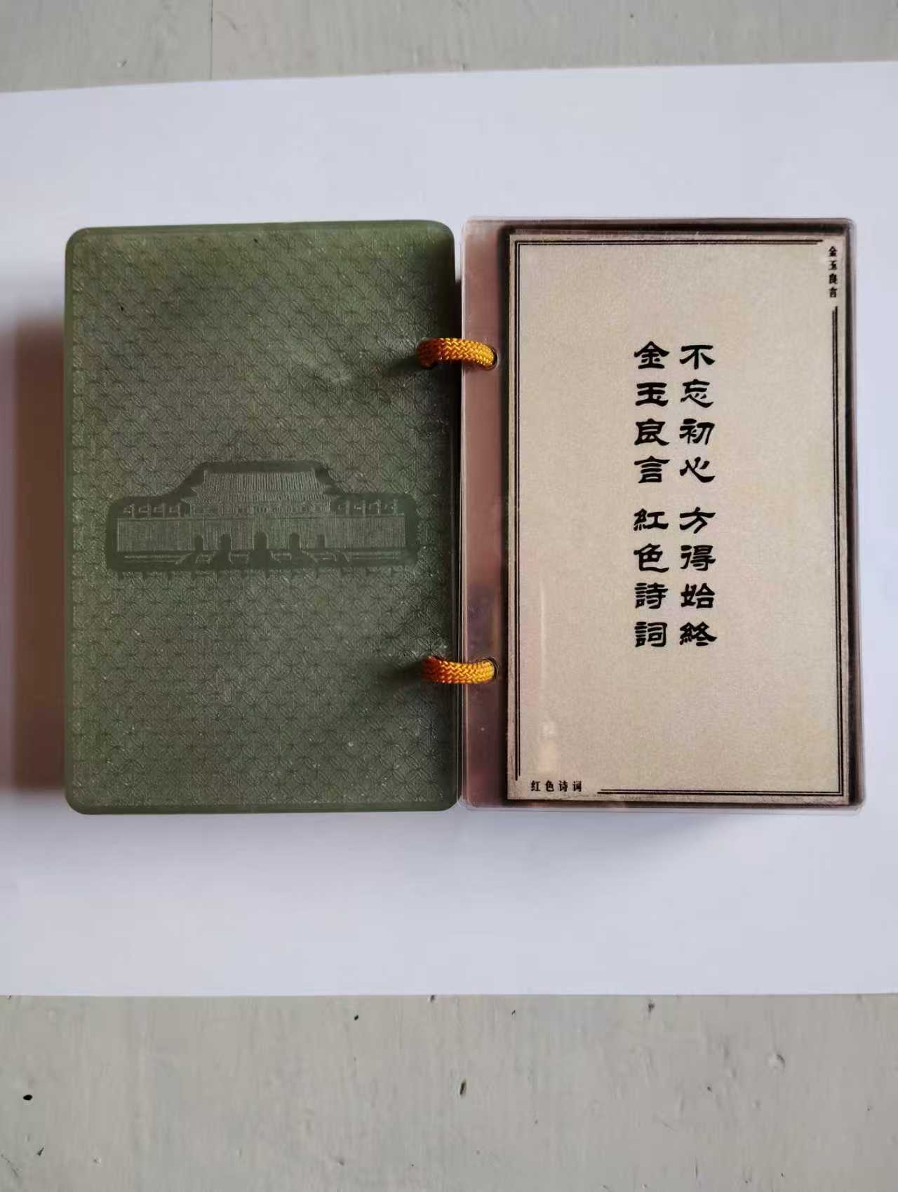 主体:以和田玉(图中为青白玉 / 青玉材质) 打造 “玉书” 造型,封面雕刻传统纹样,还嵌有金色五角星徽章。书页部分用70 克千足银制作,封面有 “金玉良言” 字样,搭配红绳 + 玛瑙珠装饰,整体置于木质底座 / 礼盒中。